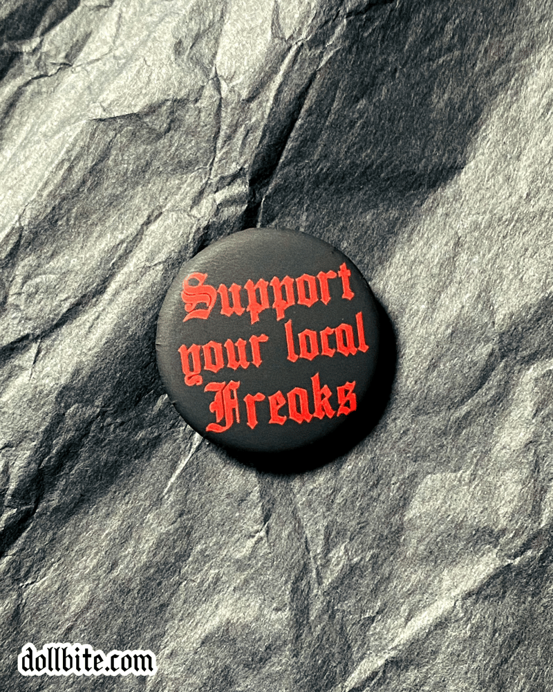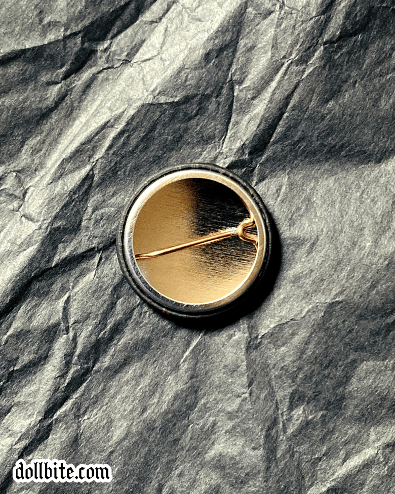 1” round button-style pins, with a matte finish. Backing is adjustable—just turn it clockwise until it’s where you want it!
