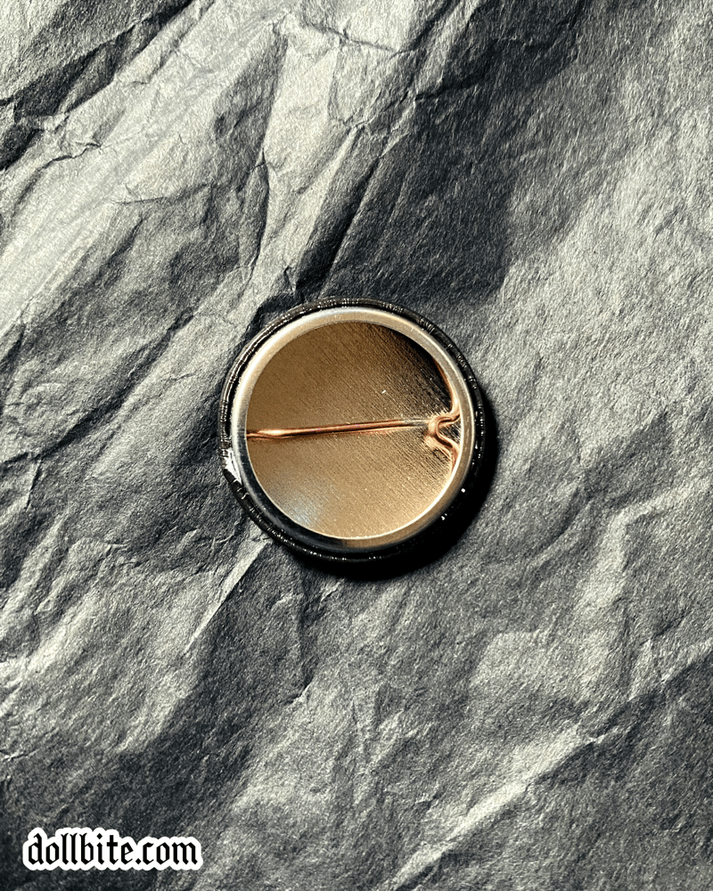 1” round button-style pins, with a glossy finish. Backing is adjustable—just turn it clockwise until it’s where you want it!