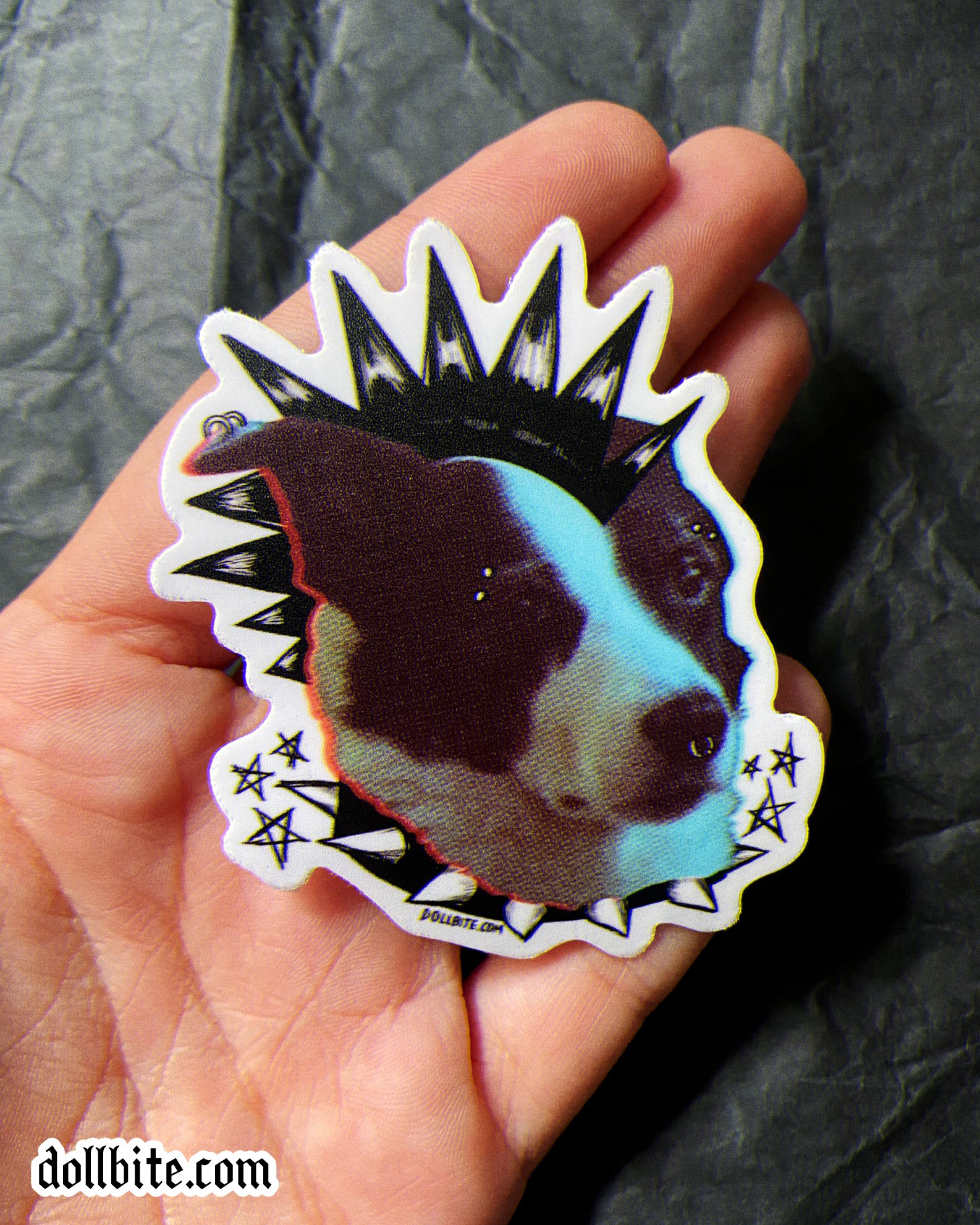 Vinyl sticker featuring our dearly departed (& dearly beloved) dog Mattie, with drawn accessories, measuring approximately 2.5 inches at widest, with a lovely & smooth matte finish. See 2nd picture for general size-reference.
